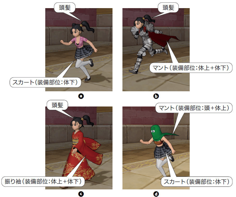 そこで、仕様として物理演算するのは2ヶ所に制限することとしたそうです。そうやって装備品を工夫することで、髪+マント+スカートといったような3ヶ所物理演算するような組み合わせを出来ないようにしています。下図のdが顕著に分かるかと思いますが、あえて髪の毛が出ないようなマントのデザインとなっています。