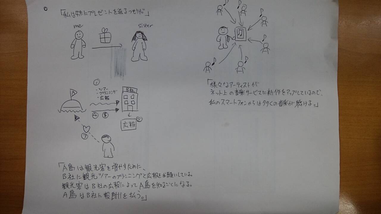 細かなグラフィックの描き方の指南から、実際に短文のストーリーを絵にしてみるという流れで説明されています。問題形式のように例文が提示されるので、実際に描きながら練習できます。 実際に私が描いたグラフィックレコーディングが以下です。「」書きの所が問題文です。