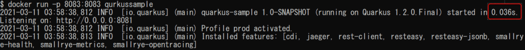 GraalVMとの親和性を謳っているだけあってNative Image生成のためのコマンドオプションも準備されていました。docker.nativeも付属している ため、docker環境だけあればローカルに導入せずともGraalVMを利用することができます。手元の環境で実行したところ、約0.04秒の爆速で起動していました。