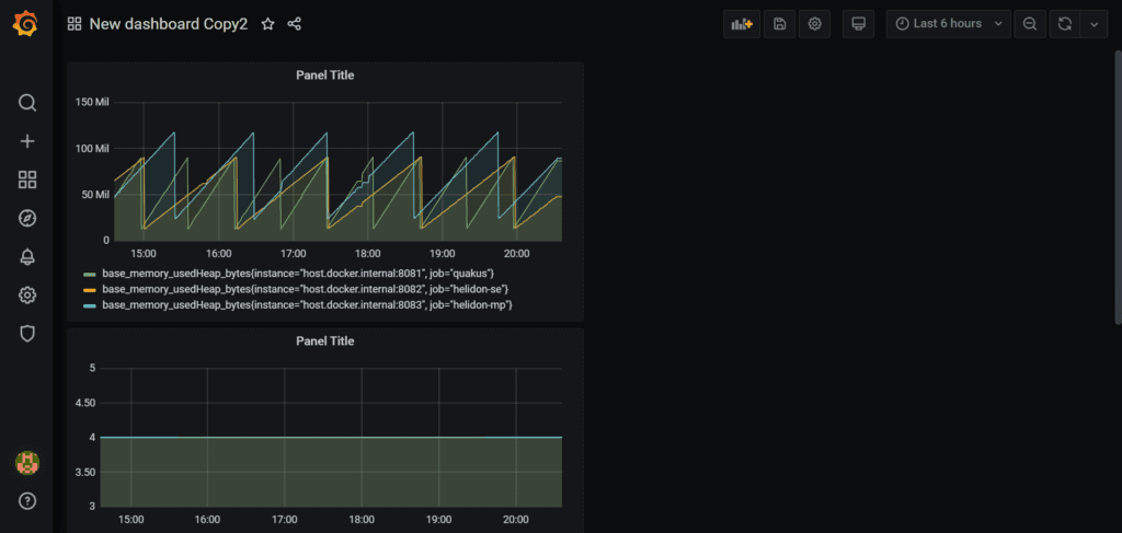 これらのフレームワークは、ヘルスチェック、分散トレーシング(Jaeger)、メトリクス(Prometheus)といった設定も容易に行えるということでそのサンプル環境も置いてありました。本書内で詳説はされていませんでしたが、今どきの周辺設備も触ってみることができます。下記はprometheus経由でgrafanaのダッシュボードに表示しているところです。dockerコンテナを立ち上げるだけで簡単に触って見れました。
