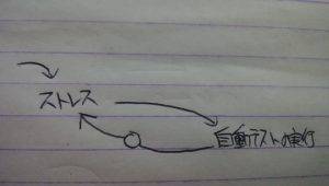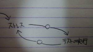 これを自動テストに差し替えたのが以下の図で、ストレス(不安)を感じたら自動テストを積極的に実行し、それによってコードの安心感が生まれてストレスが軽減することを表します。