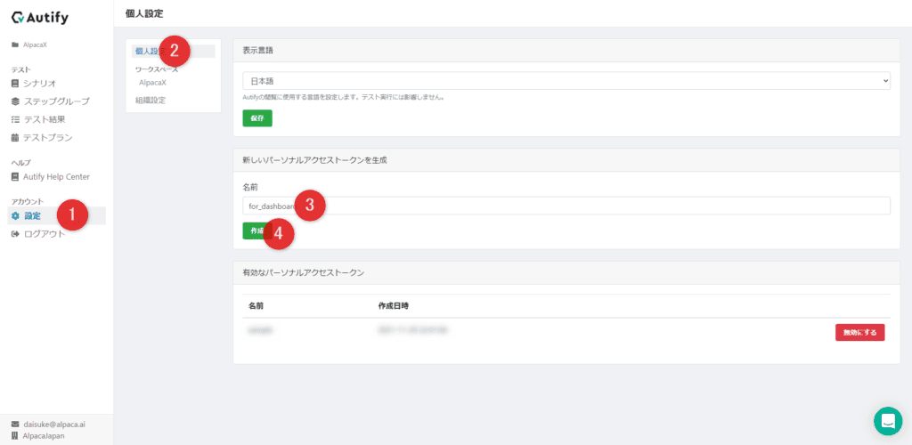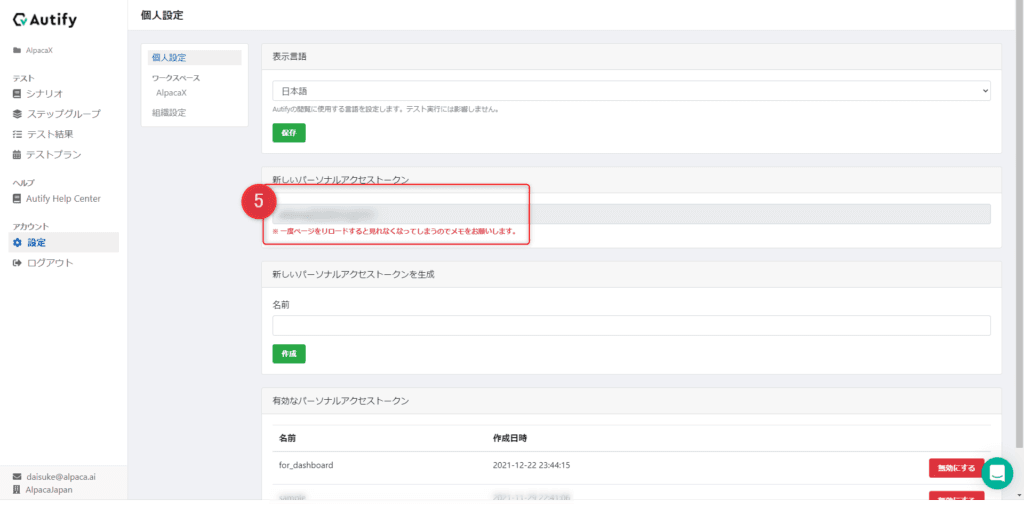 Autifyにログインしてもらい、設定 > 個人設定 画面で、「新しいパーソナルアクセストークンを生成」に任意の区別できる名前を記入して、作成ボタンを押します。するとアクセストークンが生成されるのでそれをコピーします(下図の⑤)。