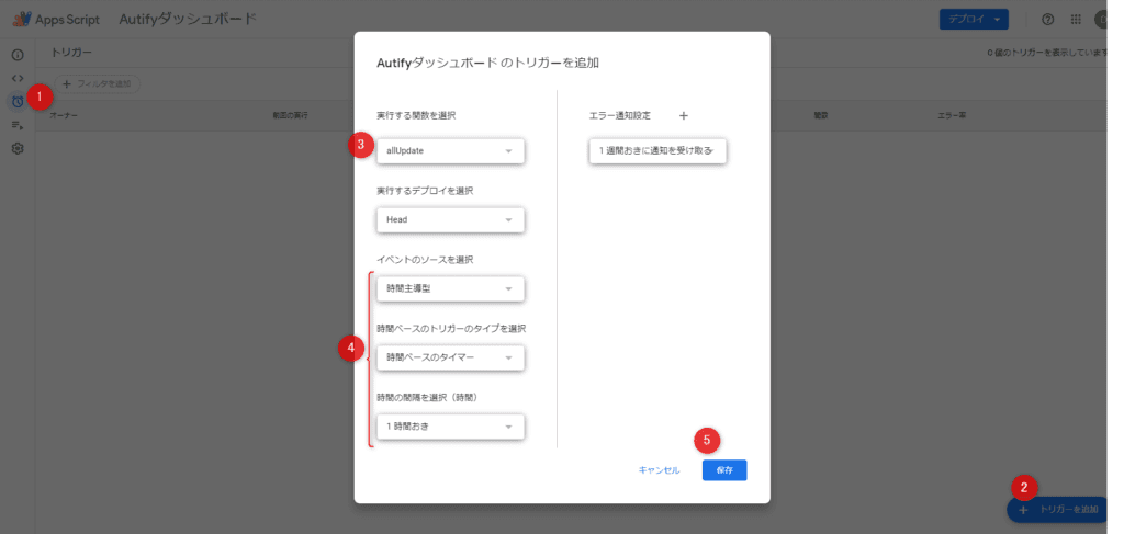 するとApps Script画面になるので、①左メニューの時計マーク(トリガーメニュー)を押して、②右下のトリガーを追加ボタンを押します。出てくるポップアップで、③実行する関数で「allUpdate 」を選択し、④実行させたいタイミングを選びます(更新させたい頻度によりますが、1時間に一度程度が妥当かと思います。適宜選んでください)。これで⑤作成ボタンを押せばトリガーが作成されて、定期的にAutifyの最新情報を取得するようになります。