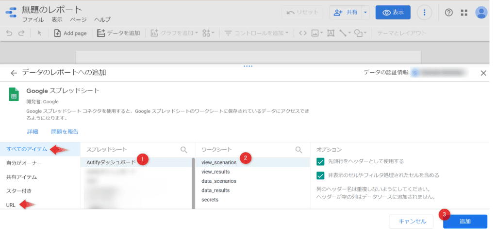 インポートするスプレッドシートを選ぶ画面になるので、先程準備したス プレッドシートのURLを「URL」のところにコピペすれば対象のスプレッドシートが選択肢に出てきます。一度参照できていれば「すべてのアイテム」にも出てきます。そこでスプレッドシート、ワークシートを選んで「追加」を押します。