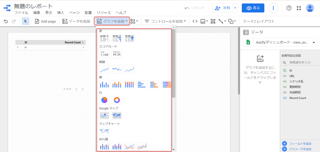 データソースが追加できたら、あとはそのデータを元に好きに表示をカスタマイズしていきます。「グラフを追加」というところから、適宜表示したいものを選び、またデータソースのカラム(スプレッドシートの列)をマッピングさせていきます。