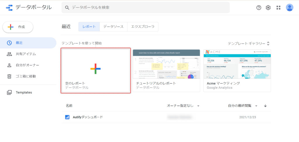 上記にアクセスして、「空のレポート」から新規で作成します。