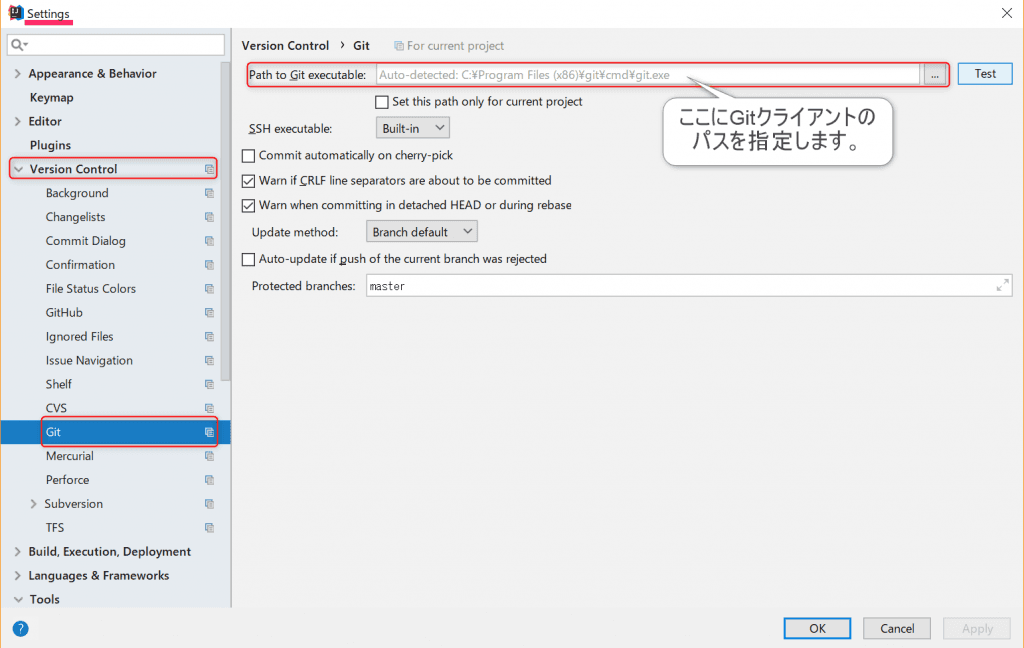 Settings>Version Controll>Gitに設定箇所があります。(最後のところはGitHubではないので選択誤りに注意。)ここの"Path to Git executable"に手順1でインストールまたはアップデートしたGitクライアントソフトのパスを指定します。ただし、多くの場合、以下の画像にある通り、"Auto-detected"と、自動で捜索してくれているので、それに間違いがないか確認すれば大丈夫です。