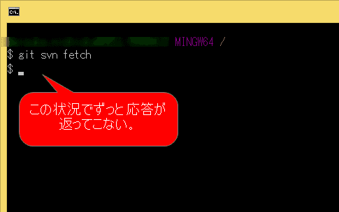gitコマンド(例えば「git svn fetch」)を実行すると、ずっと応答が返ってこないという事が起こりました。