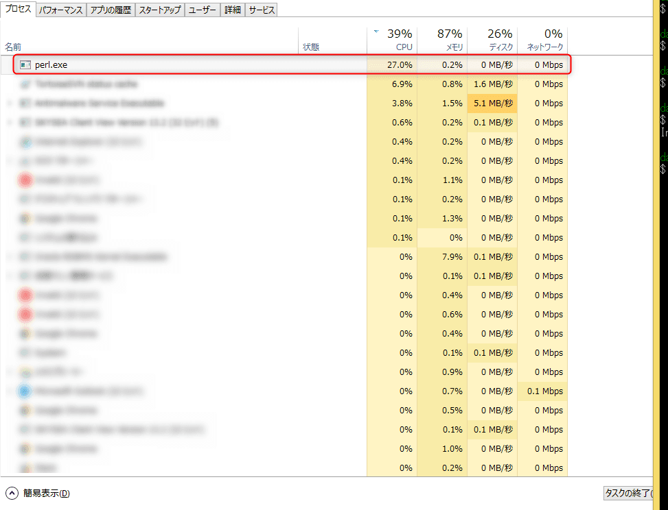 タスクマネージャを見てみると、「perl.exe」なるタスクがgitコマンド実行後に内部的に呼び出されて起動されているようで、これが高い負荷で張り付いたまま終了していなかった。どうやら無限ループしているような挙動に見える。