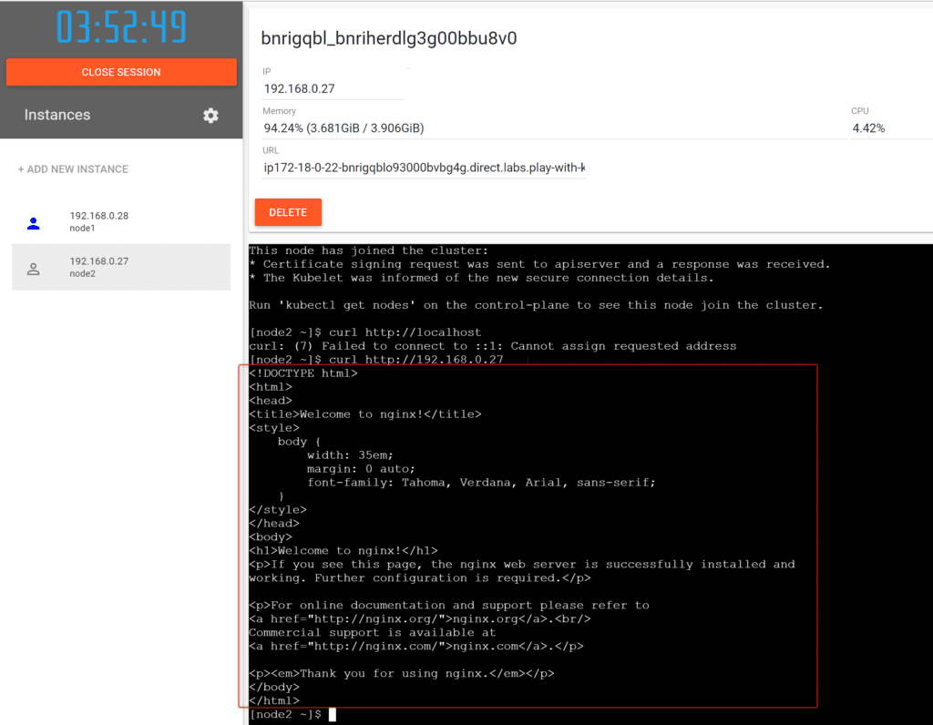 これでnginxアプリに接続できるはずなので、slaveのnodeからcurlコマンド(URLにアクセスするコマンド)を実行してみます。下記を指定したIPアドレスに変更して実行してください。するとHTMLがコンソールに出力されるはずです。