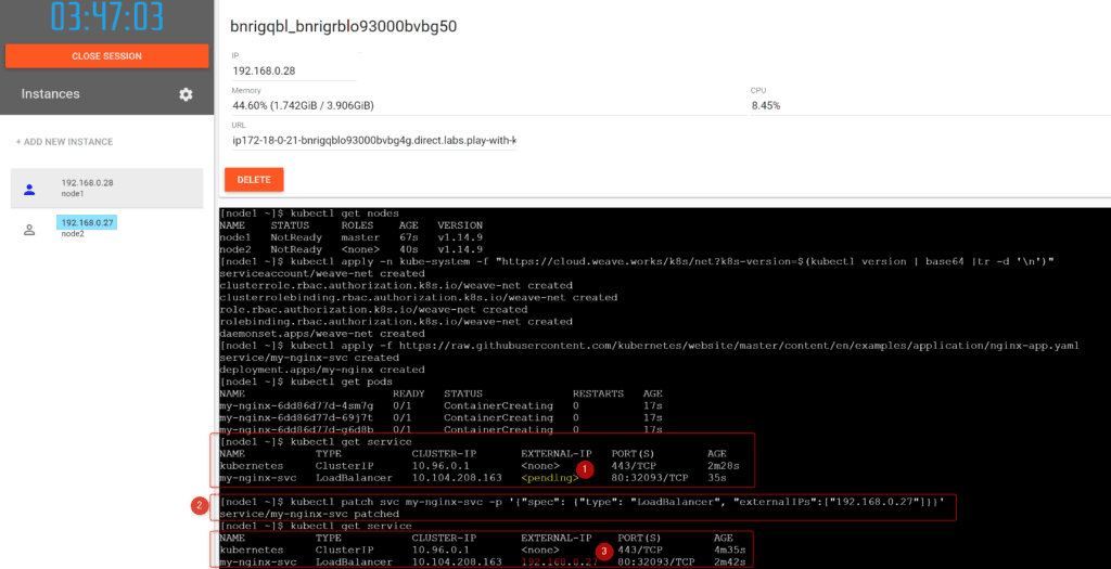 対象のサービスに外部IPアドレスを指定して、アクセスできるようにします。slaveのnodeに記載されているIPアドレスに以下のXX部分を書き換えてmasterのnodeで実行します。(上記画像の例だと192.168.0.27となるようにします。)