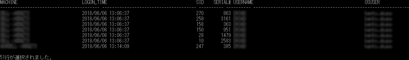 1select MACHINE, LOGON_TIME, SID, SERIAL#, USERNAME, OSUSER