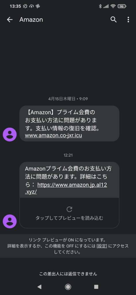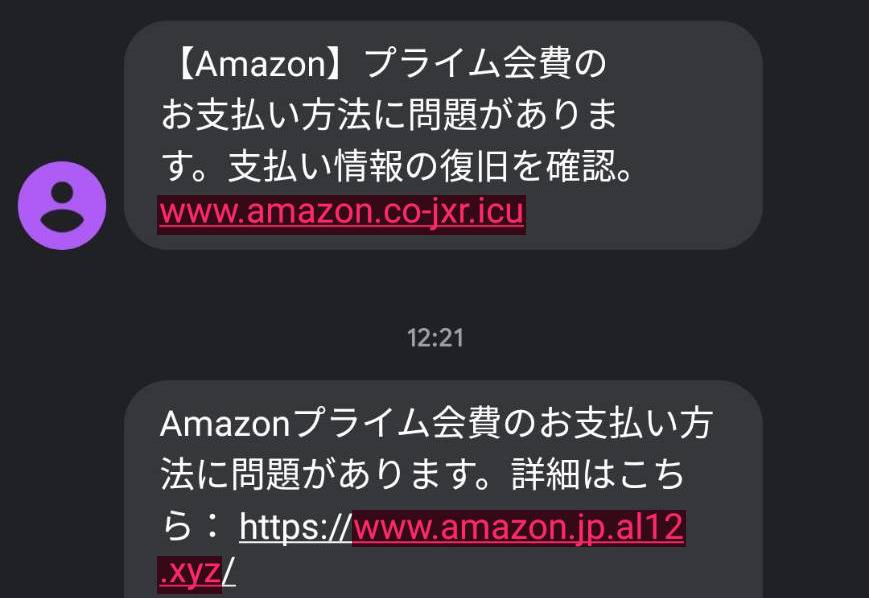 こんなSMSが来ました。Amazonプライムに加入しているので、一瞬ハッと思ったのですが、すぐにフィッシング詐欺だと気づいて無視していました。
