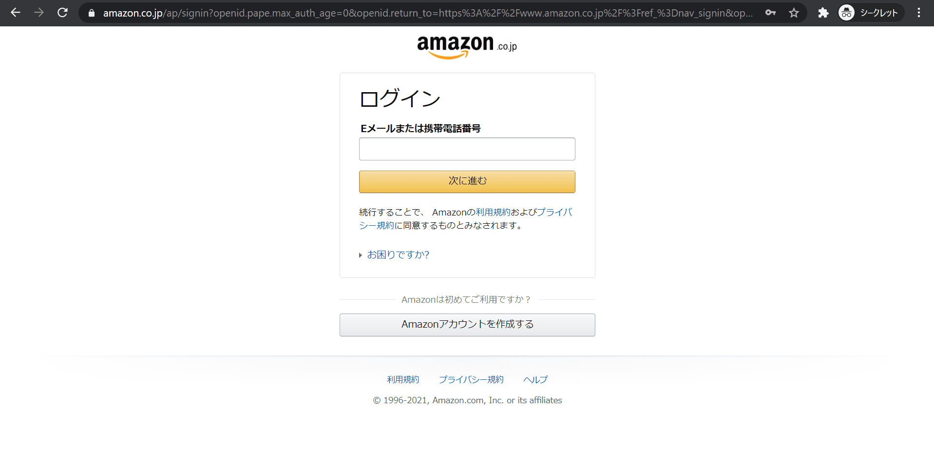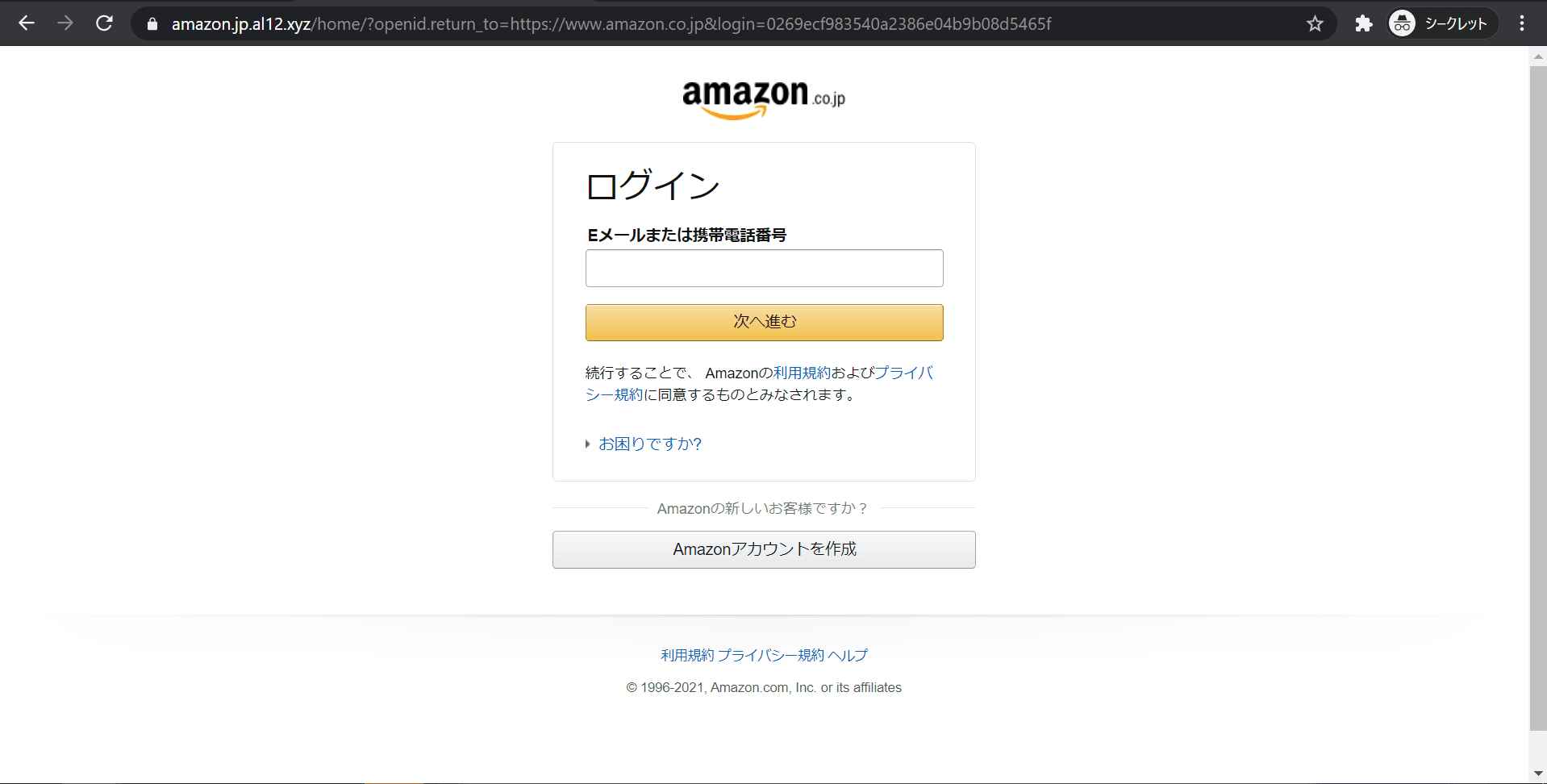 では、上記チェックの確認を無視して、この怪しいURLにアクセスしてフィッシング詐欺に引っかかってみます。まず一つ目にアクセスすると下記の画面になりました。
