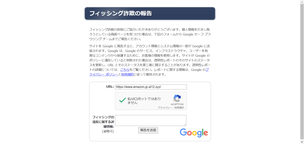 また、フィッシング詐欺サイトを発見したら、下記のGoogle セーフ ブラウジング チームなどに報告すると良いでしょう(実際、2つ目のURLは報告しました)。
