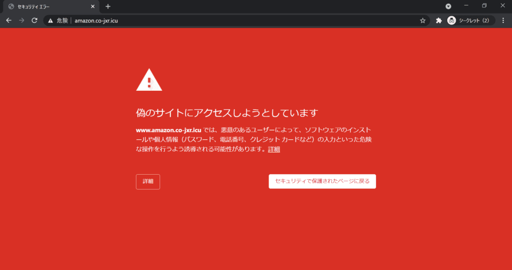 明らかにアクセスしては駄目なことが分かる画面が出てきました。これは、googleなどブラウザベンダー企業がこうしたフィッシング詐欺サイトをブラックリストで保持していて、サイトにアクセスする前にユーザを守るために警告を出してアクセスを止めてくれています。こうしたセキュリティの強化には感謝です。しかしながら、イタチごっこではあるので、必ずしもこれにより安全が保たれるわけではないので、ユーザ自身の自衛も大事です。