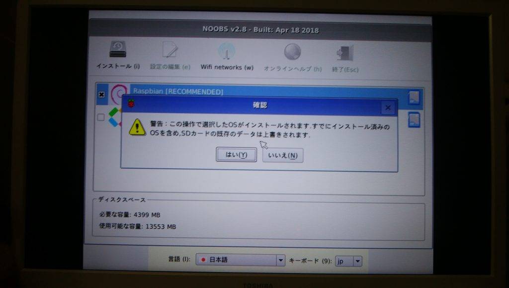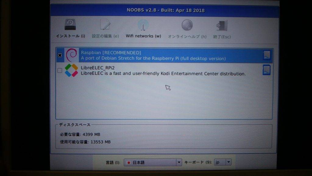 NOOBSの標準インス トール方法を実施するだけです(ディスプレイを写真で撮ったので画像が少し見辛いです)。
