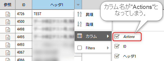 "actionColumn"コンポーネントの仕様です。たいていのgrid部品は、text要素に指定した文字列が、ヘッダにも、メニュー内のカラム要素にも同じ名称で表示されるのですが、"actionColumn"は別の要素で指定をする必要があり、未指定だとデフォルトの"Actions"が表示されてしまうというわけです。