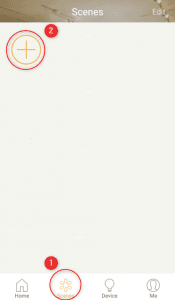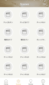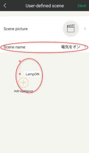 ⑤ Intelligent Home Center設定方法(シーン編) 残念ながら、上記で終わりではありません。今までの設定で、IHCのアプリからは各家電を操作できますが、Google Homeを使った音声操作はできません。Google Homeに認識させるには、シーンというものを定義しなければなりません。Google HomeでRM mini3の機能を呼び出せるのは基本的にはシーンだけです。 まず、「シーン」に移動し、「+」ボタンを押します。