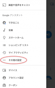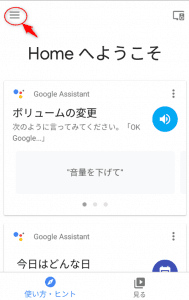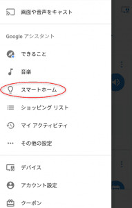 ① Google Homeにアプリを紐付ける。 メニューを開き、